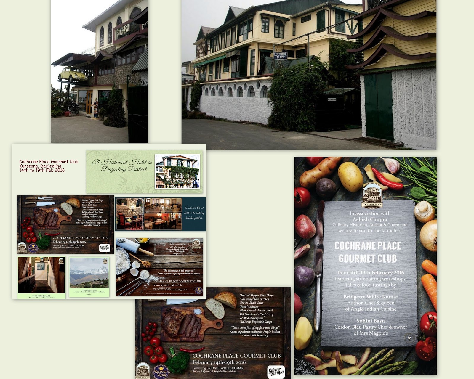 I’m just repeating the words of Dr Ashish Chopra "Its all happening at COCHRANE PLACE,KURSEONG in the midst of Tea country this month .. Bridget White Kumar weaves her magic with Anglo Indian cuisine, Sohini Basu, Cordon Bleu Pastry chef does magic with her cup cakes, Susmit Bose, the legendary Urban folk musician enthralls us with his golden voice, Ramaa Shanker cooks up some soul food of tasty Vegetarian Dishes, Kaveri Ponnapa Kambiranda, the celebrity author, Anthropologist and Gourmand teaches us how to make a Coorg special and one of my favourites Pandi curry, Avijit Dutt, the grand theatre man and actor shares his travel and culinary experience, Yours truly Ashish Chopra musters up dishes from my forthcoming book Tribal cuisines of India and introduces the black bird kadaknath. GROVER ZAMPA joins in the fun and gets us to taste their wines and pair them with respective cuisines”